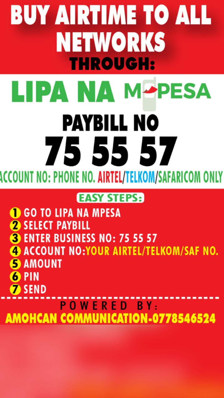 You can now top up your Telkom& Airtel airtime via M-Pesa paybill 755557. No transaction cost for amount 100 and below.