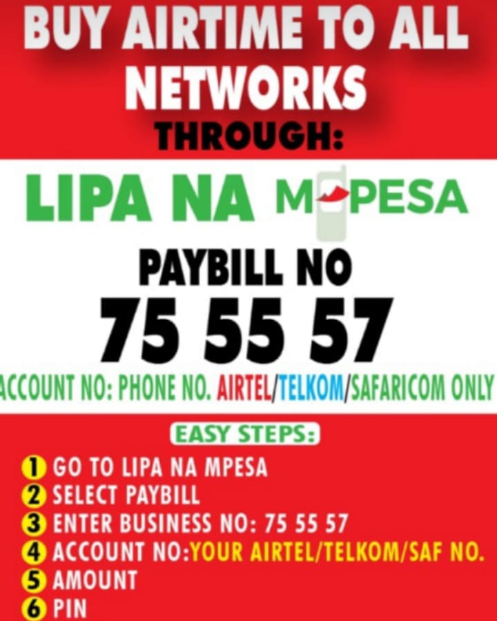 AIRTIME imeisha…. Uko Jam!! OfficeAma REMOTE Area!! RELAX!! You canBuy AIRTIME with AMOHCANCOMThrough m-pesaPaybill 755557Enter ur number 07…Then Amount…Pin…24/7 service@ur HandAnytime & AnywhereNo transaction FEE from 5-100 is free